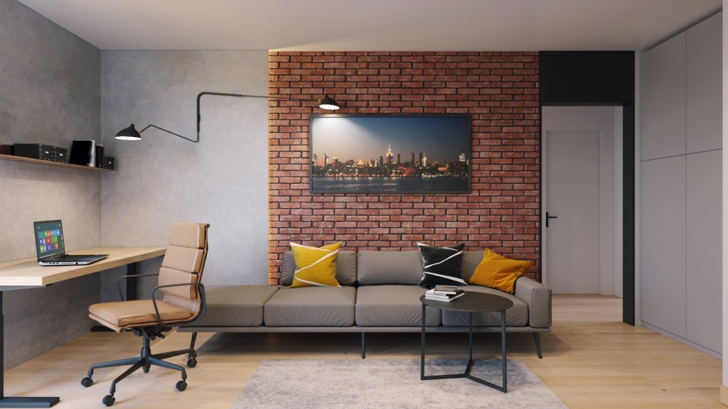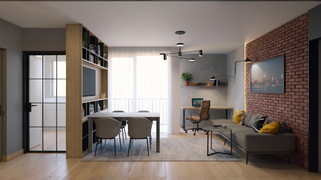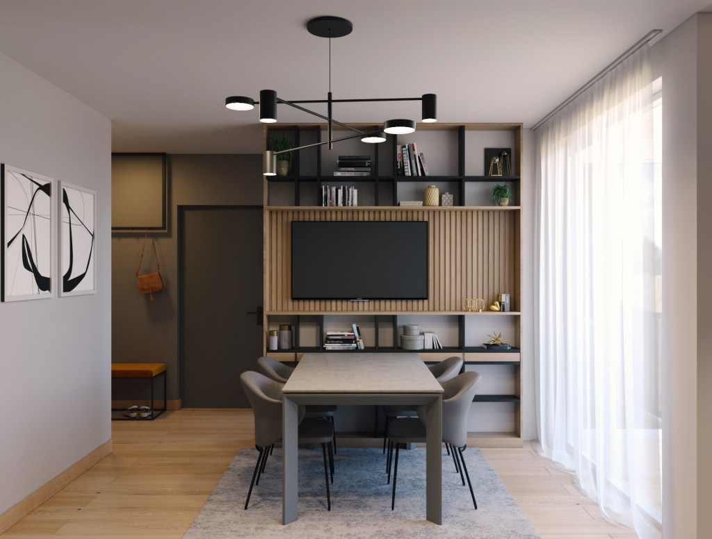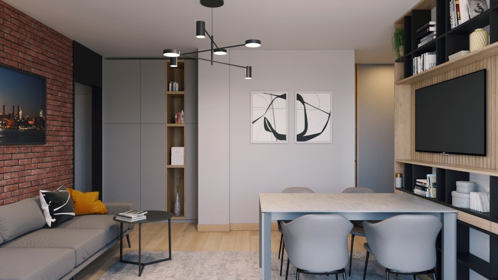 Amenajarea minimalista in cu accente industriale se citeste atat la nivelul finisajelor folosite cat si al culorilor propuse. Atmosfera cosy si intima a spatiului este completata de sursele de iluminat ambiental, design-ul pieselor de moblier si a accesoriilor alese.
